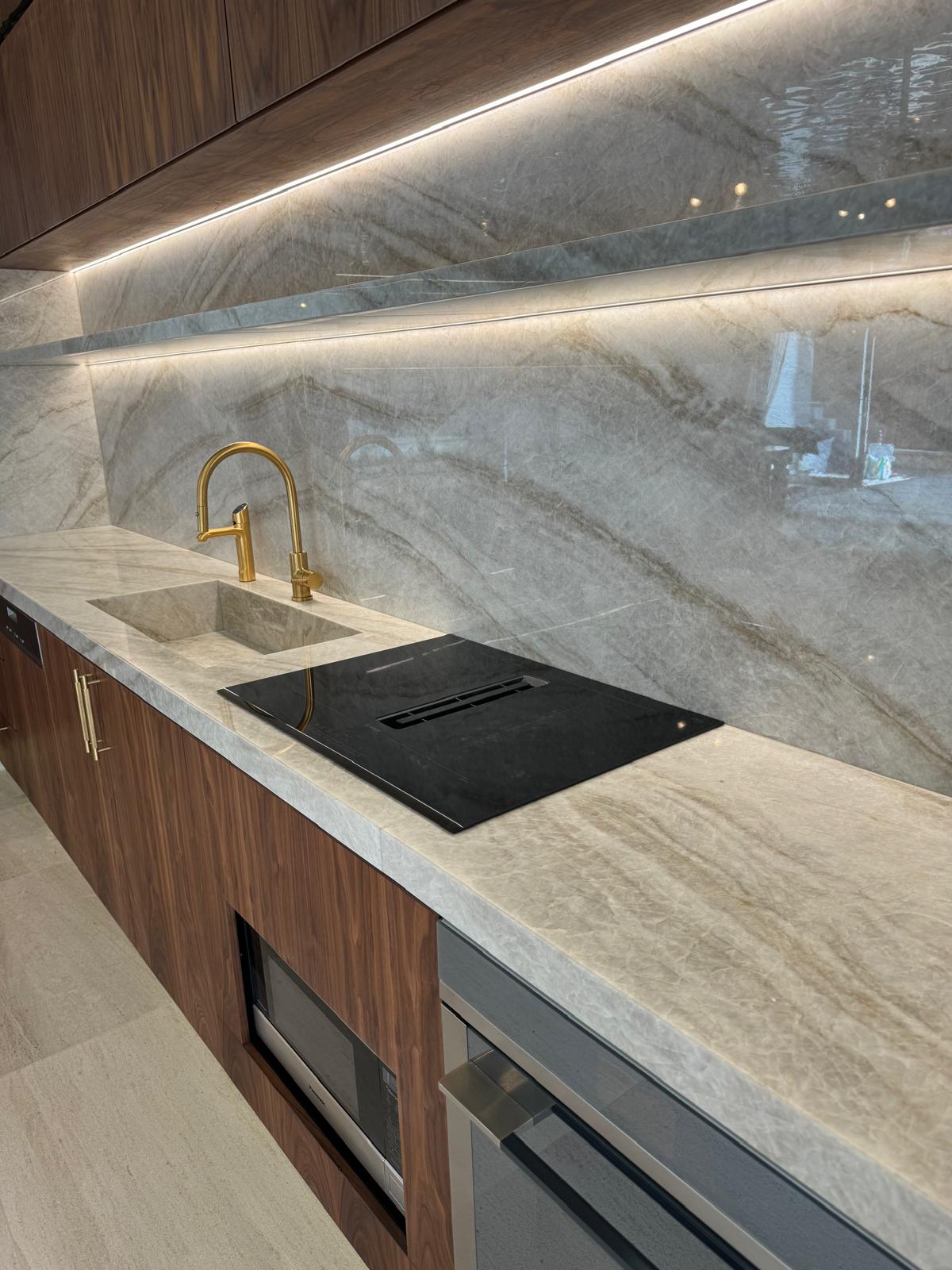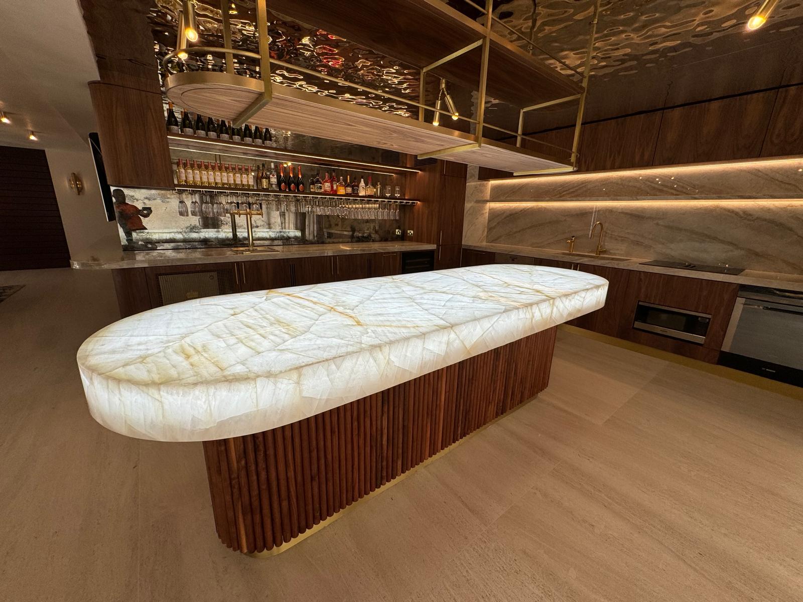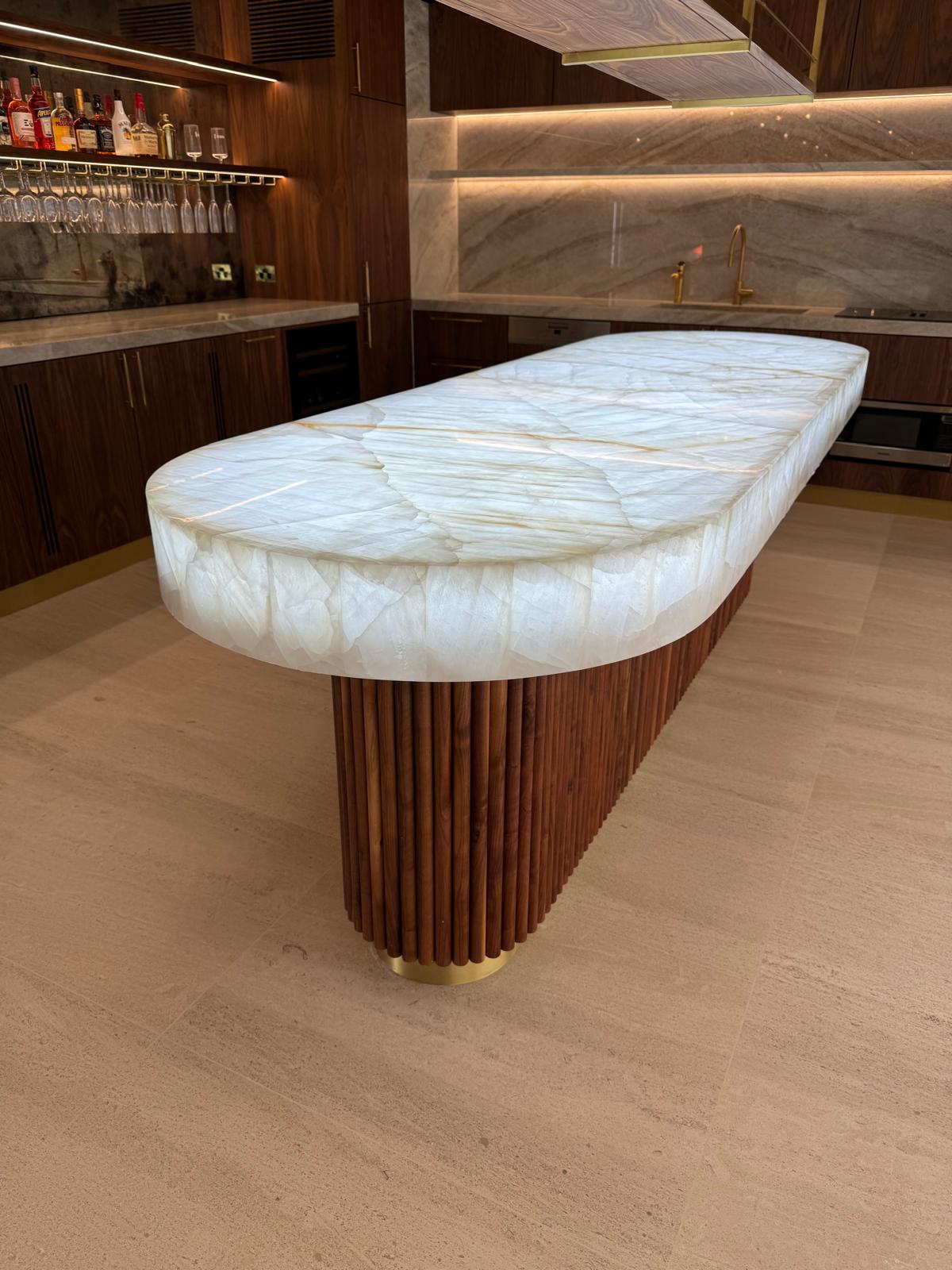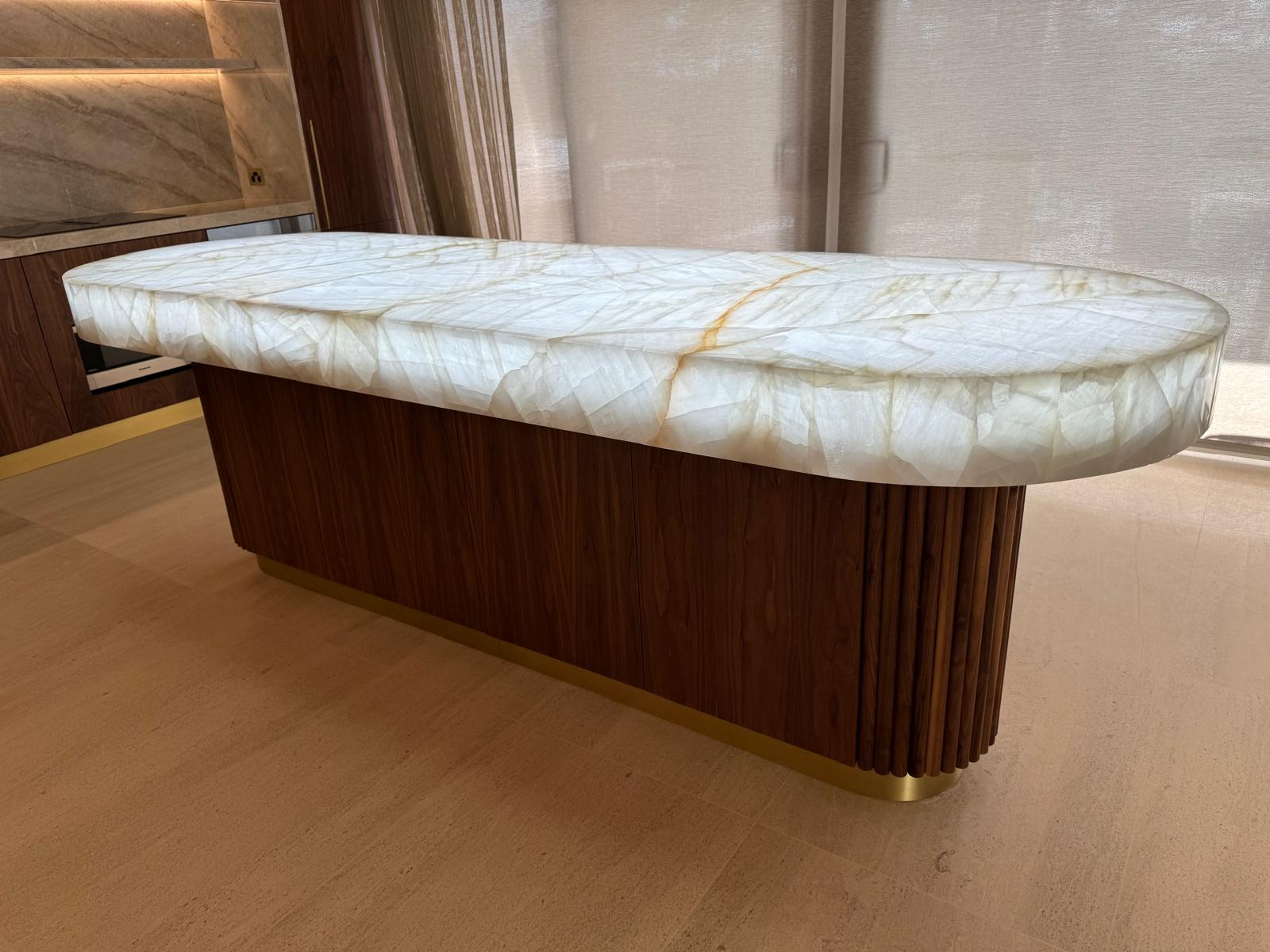 Stonen Fabrication, recently completed a high-end project in Clontarf, NSW, featuring stunning Taj Mahal quartzite benchtops and a luxurious white Onyx island with backlighting. The Taj Mahal stone was meticulously selected for its elegant, warm tones and intricate veining, providing a sophisticated and timeless look for the kitchen benchtops. The centerpiece of the space is the backlit white Onyx island, which creates a breathtaking focal point with its translucent qualities and soft glow, enhancing the ambiance of the entire room. This project not only showcased the exquisite beauty and versatility of natural stone but also demonstrated the precision and craftsmanship required to deliver a flawless installation in a residential setting.
