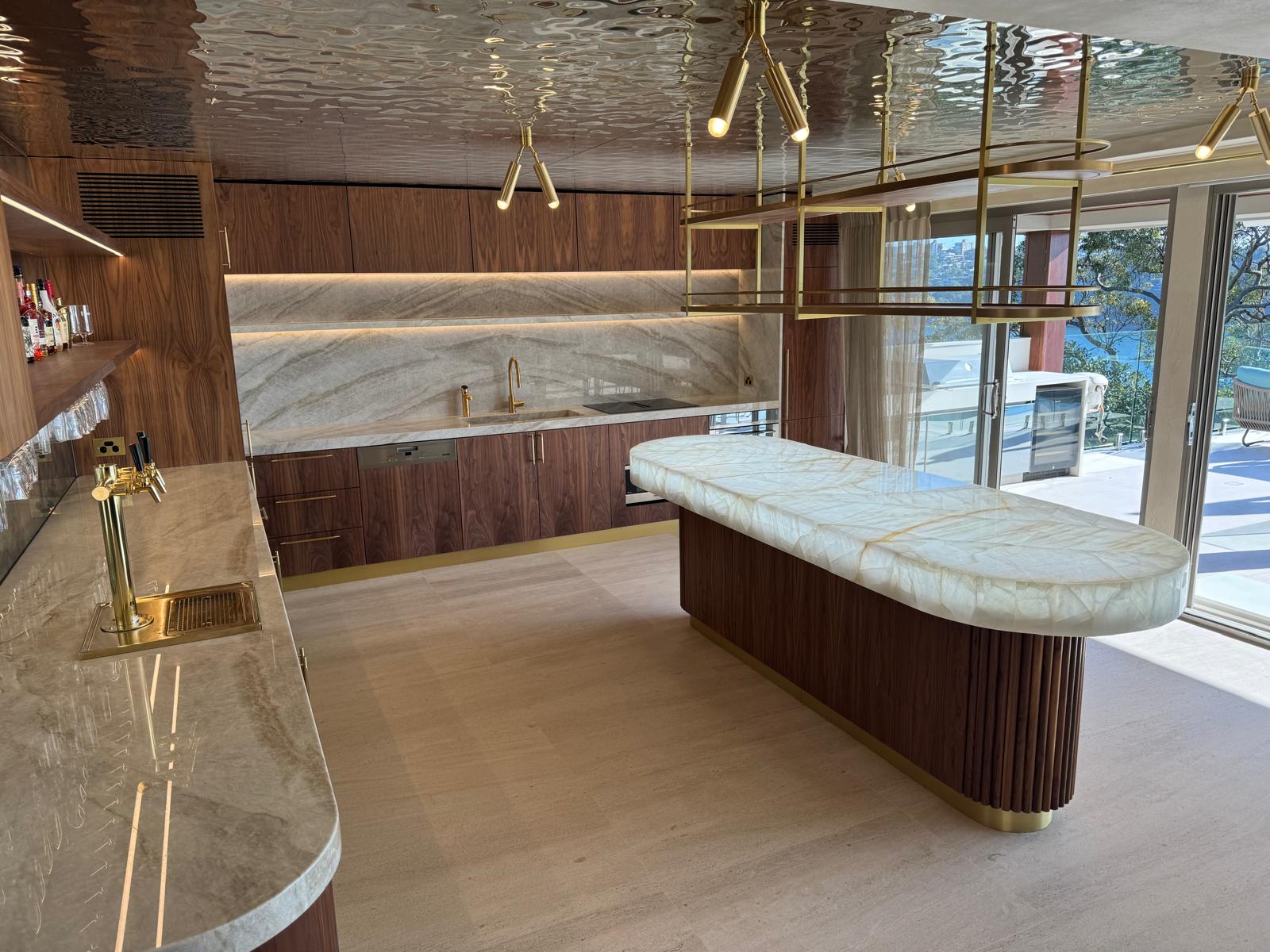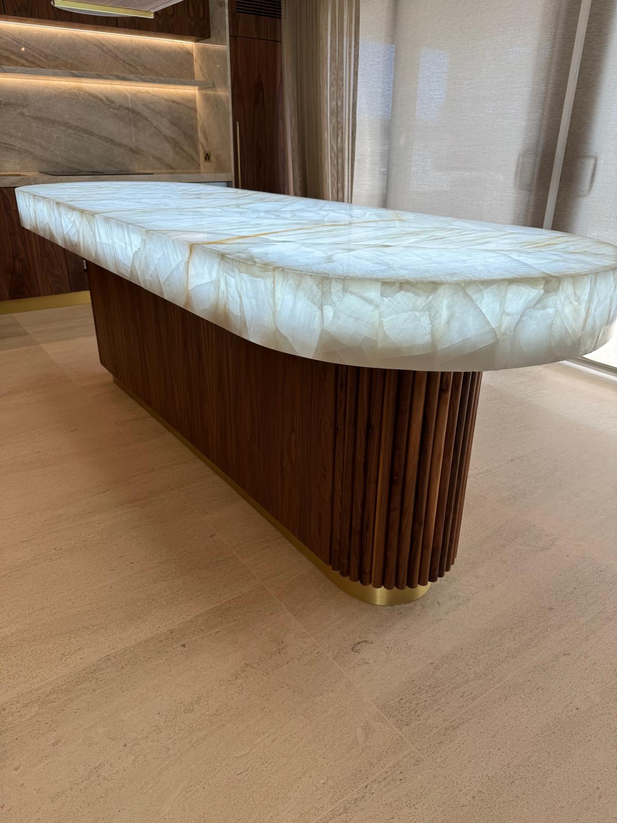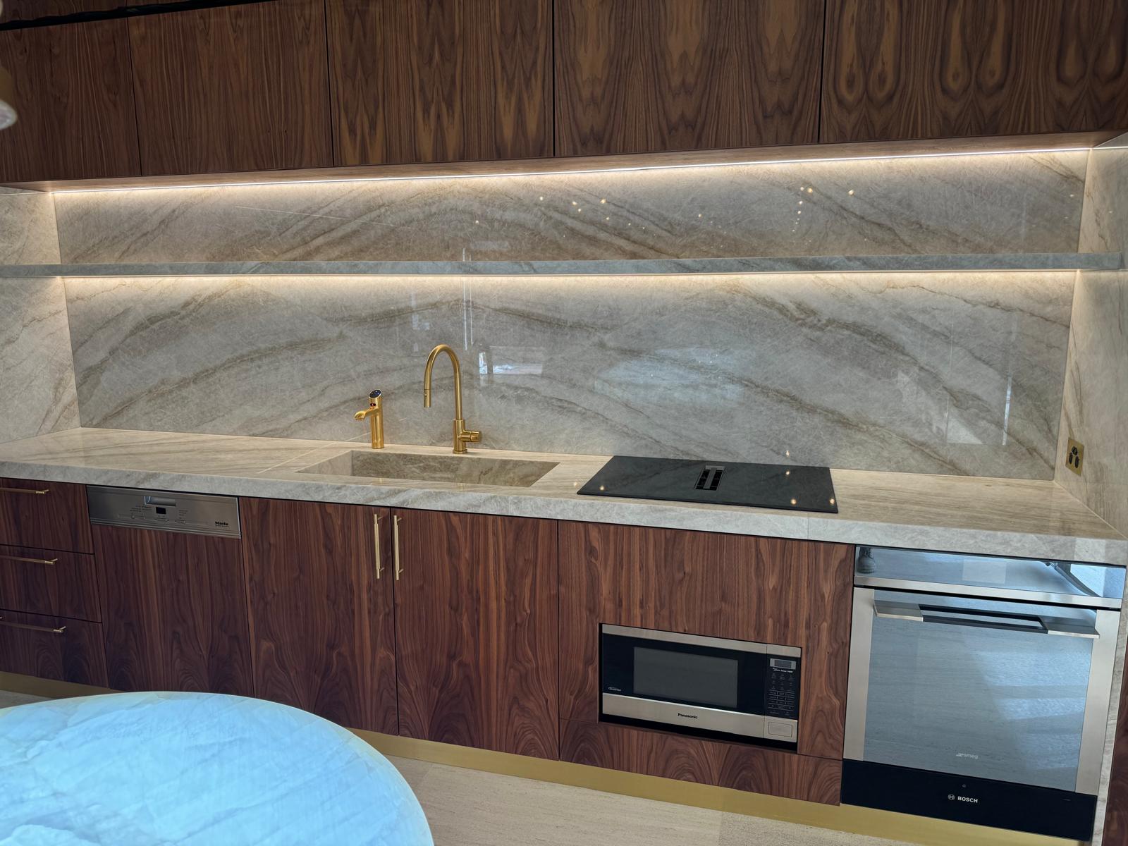 Stonen Fabrication, recently completed a high-end project in Clontarf, NSW, featuring stunning Taj Mahal quartzite benchtops and a luxurious white Onyx island with backlighting. The Taj Mahal stone was meticulously selected for its elegant, warm tones and intricate veining, providing a sophisticated and timeless look for the kitchen benchtops. The centerpiece of the space is the backlit white Onyx island, which creates a breathtaking focal point with its translucent qualities and soft glow, enhancing the ambiance of the entire room. This project not only showcased the exquisite beauty and versatility of natural stone but also demonstrated the precision and craftsmanship required to deliver a flawless installation in a residential setting.